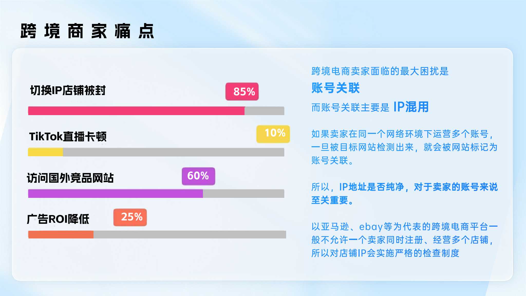 跨境電商行業(yè)專線方案:各電商賬號(hào)平臺(tái)防關(guān)聯(lián)解決方案提供純凈原生IP,保證賬號(hào)安全穩(wěn)定
